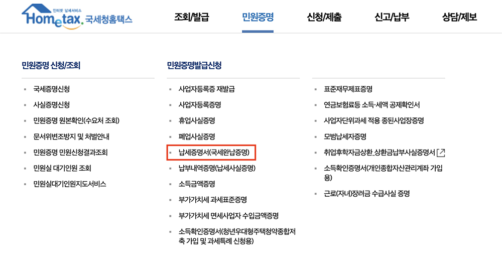 ● 민원증명 → 납세증명서(국세 완납증명) 클릭