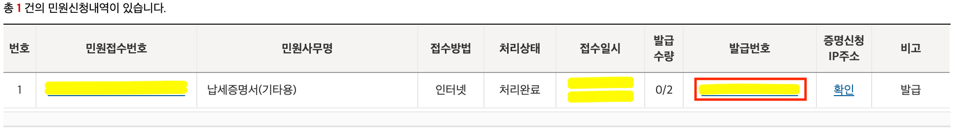 ● 인터넷 접수 목록 조회 화면에서 발급번호 클릭 → 인쇄 클릭