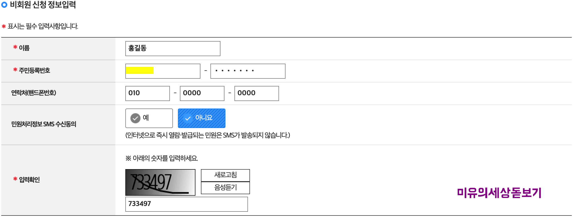 ● 개인 정보 및 고유 식별 정보 수집 동의 및 비회원 신청 정보 입력하기