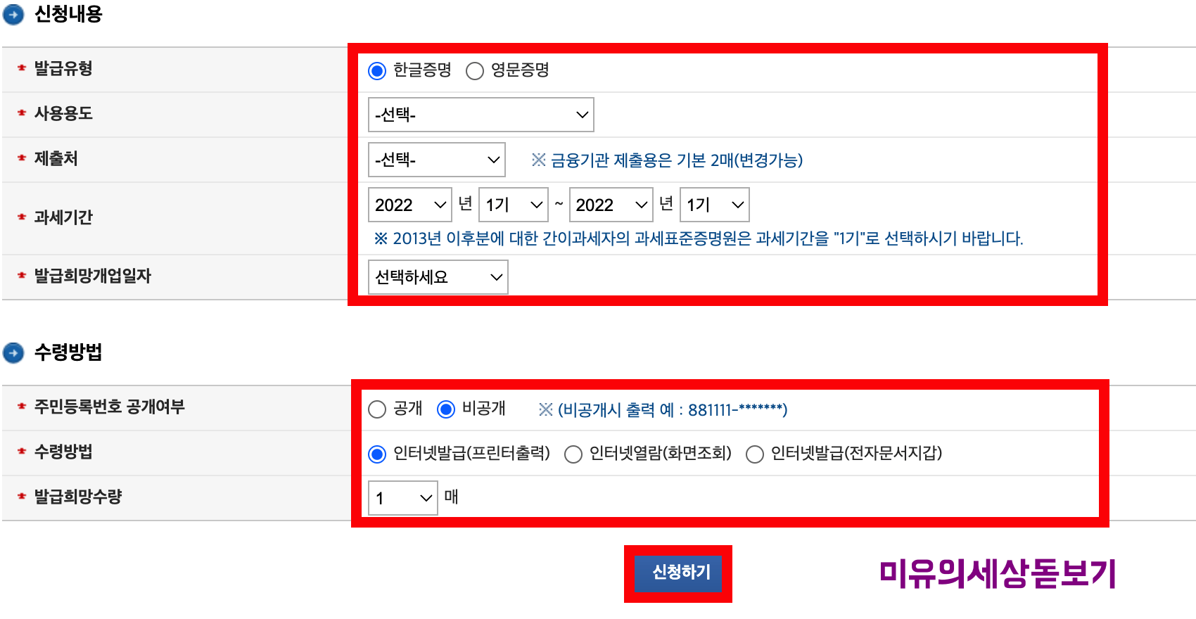 발급 유형 ( 한글 증명, 영문증명 중 선택 ) → 사용용도 선택 ( 입찰계약용, 수금용, 관공서 제출용, 여권 또는 비자 신청용, 금융기관제출용, 신용카드 발급용, 건강보험, 국민연금공단 제출용, 기타 ) → 제출처 선택 ( 금융기관, 관공서, 학교, 거래처, 조합/협회, 외교부/재외공관, 기타) → 과세기간 선택 → 수령방법 선택 및 신청하기 클릭